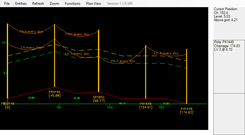 Enter ground line, poles and conductors. Check sags and clearances. Add pole top equipment. Export to DXF or PDF.